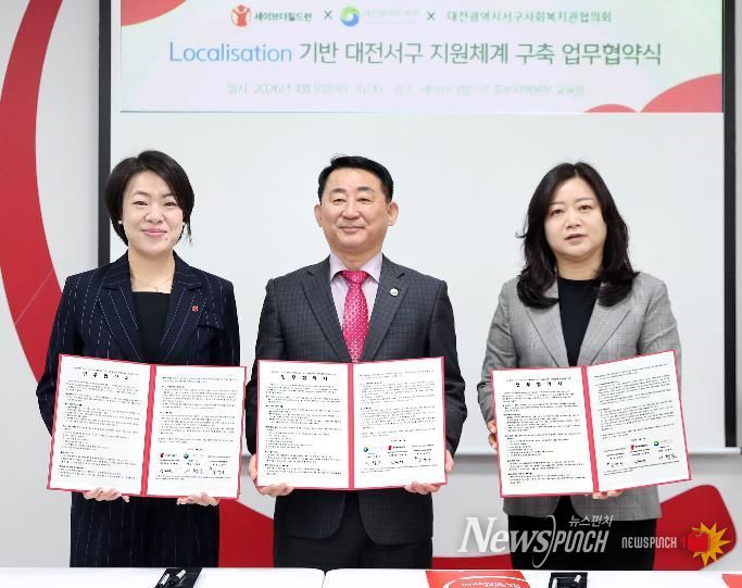 뉴스펀치 이현승 기자 | 대전 서구는 지속 가능한 취약계층 아동 지원체계 마련을 위해 9일 세이브더칠드런 중부지역본부 대전아동권리센터에서 3자 업무협약을 체결했다.