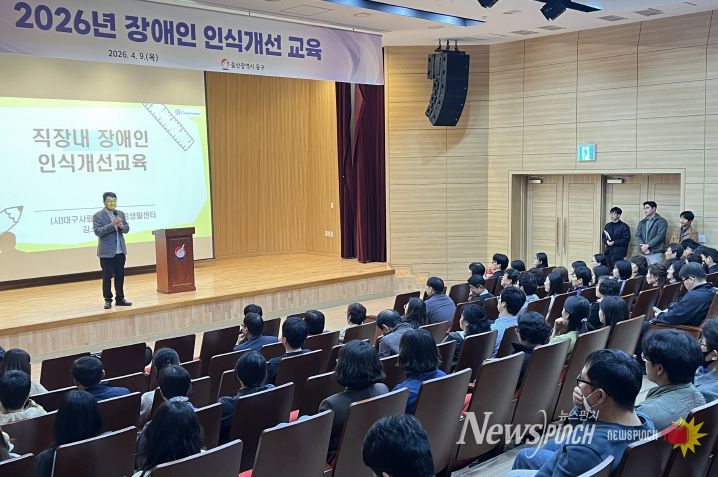 뉴스펀치 김윤걸 기자 | 울산 동구는 4월 9일 오전 10시와 오후 2시 2회로 나눠 동구청 5층 중강당에서 직원과 주민 등 650여 명을 대상으로 ‘2026년 장애인 인식 개선 교육’을 했다.