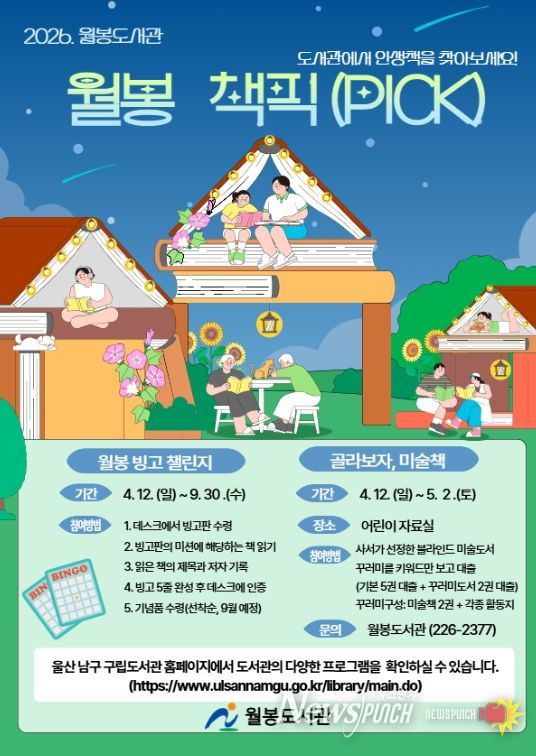 뉴스펀치 김윤걸 기자 | 울산 남구 월봉도서관은 지역 주민들의 독서 의욕을 고취하고 도서관 이용을 활성화하기 위해 오는 12일부터 9월30일까지 맞춤형 독서 프로그램인 ‘월봉 책픽’(PICK)을 운영한다고 9일 밝혔다.