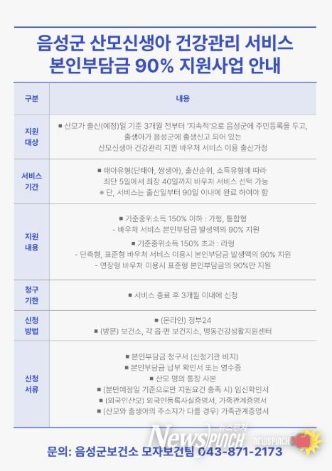 뉴스펀치 이현승 기자 | 음성군은 산모와 신생아의 건강 증진과 출산 가정의 경제적 부담 완화를 위해 ‘산모·신생아 건강관리 지원사업’ 본인부담금의 90%를 지원하고 있다고 밝혔다.
