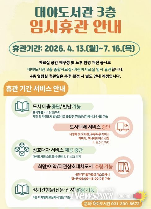 뉴스펀치 박상훈 기자 | 군포시 대야도서관은 노후된 자료실 환경을 개선하고 이용자 중심의 효율적인 공간 재구성을 위해 오는 4월 13일부터 7월 16일까지 리모델링 공사를 실시하고, 해당 기간동안 3층 자료실을 임시휴관한다고 밝혔다.