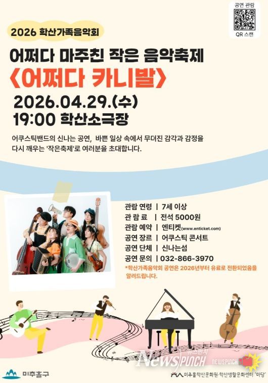뉴스펀치 정홍균 기자 | 인천 미추홀구 학산 생활 문화센터 학산소극장에서 오는 4월 29일 저녁 7시 ‘2026년 학산 가족 음악회’의 첫 번째 공연을 개최한다.