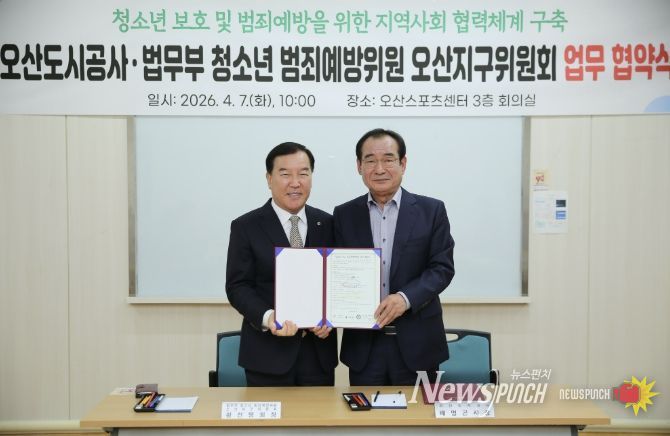 뉴스펀치 박상훈 기자 | 오산도시공사는 지난 7일 법무부 청소년범죄예방위원 오산지구위원회와 함께 오산시 아동·청소년의 사회 안전망 구축과 보호 강화를 위한 업무협약을 체결했다고 밝혔다.