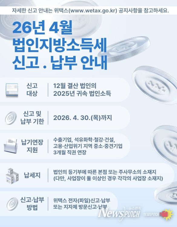 뉴스펀치 정홍균 기자 | 옹진군은 오는 4월 30일까지 2025년 귀속 사업연도 법인소득에 대한 법인지방소득세 신고・납부 기간을 운영한다고 밝혔다.