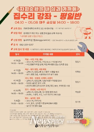 뉴스펀치 김용희 기자 | 광주 동구 친환경자원순환센터는 일상 속에서 집수리 노하우를 익힐 수 있는 ‘2026 동구 집수리 강좌’를 5월 9일까지 약 한 달간 운영한다고 밝혔다.
