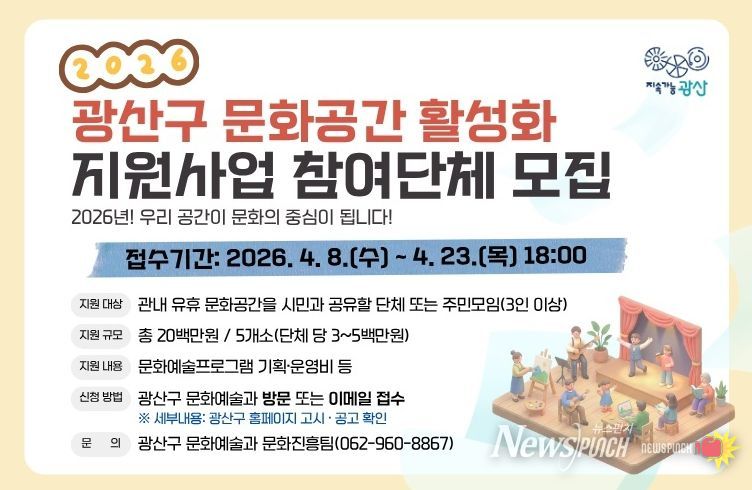 뉴스펀치 김용희 기자 | 광주 광산구가 지역 유휴 문화공간을 열린 시민 문화 거점으로 활용하는 ‘2026년 문화공간 공유 활성화 지원사업’을 추진한다.