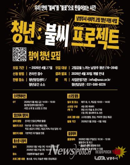 뉴스펀치 박상훈 기자 | 남양주시는 13일 사회적 고립 청년의 일상 회복과 관계 형성을 지원하는 ‘청년:불씨 프로젝트’ 참여자를 오는 27일까지 모집한다고 밝혔다.