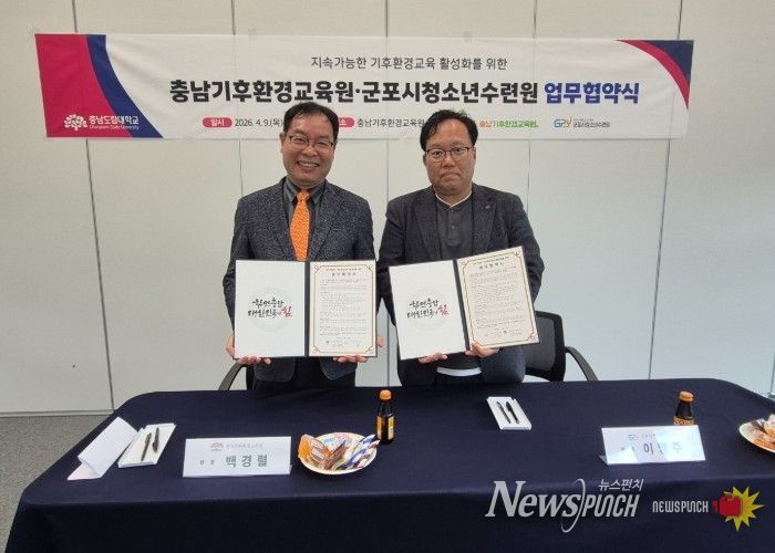 뉴스펀치 박상훈 기자 | (재)군포시청소년재단이 운영하는 군포시청소년수련원(충남 청양)과 충남기후환경교육원(충남 청양)은 4월 9일, 미래세대의 지속가능 기후환경교육 활성화를 위한 업무협약을 체결했다고 전했다.