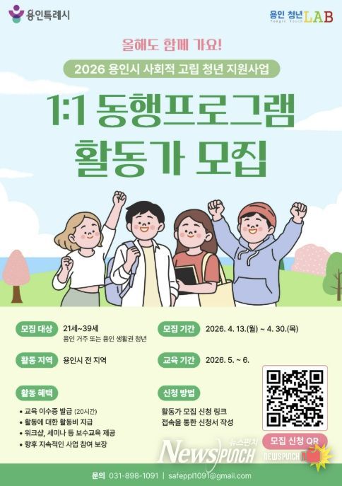 뉴스펀치 박상훈 기자 | 용인특례시는 사회적 고립 청년의 정서적 회복과 사회 복귀를 지원하기 위한 동행 활동가 20명을 모집한다고 14일 밝혔다.