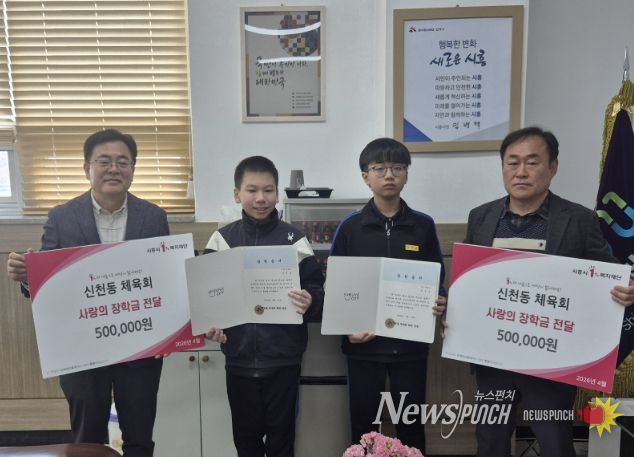 뉴스펀치 박상훈 기자 | 시흥시 신천동 체육회는 지난 4월 13일 신천동 행정복지센터에서 관내 신천중학교 학생 2명에게 장학금을 전달하며 따뜻한 이웃 사랑을 실천했다.