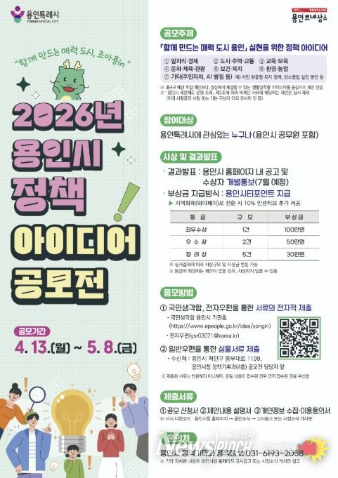뉴스펀치 박상훈 기자 | 용인특례시는 시민 참여를 통한 정책 발굴을 위해 ‘2026년 용인시 정책 아이디어 공모전’을 오는 5월 8일까지 진행한다고 15일 밝혔다.