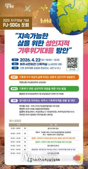 뉴스펀치 박상훈 기자 | 파주시는 오는 22일 14시, 파주시지속가능발전협의회가 지구의 날을 기념해 ‘지속가능한 삶을 위한 성인지적 기후위기 대응 방안’을 주제로 파주시민회관 다목적실에서 ‘기후격차 포럼’을 개최한다고 밝혔다.