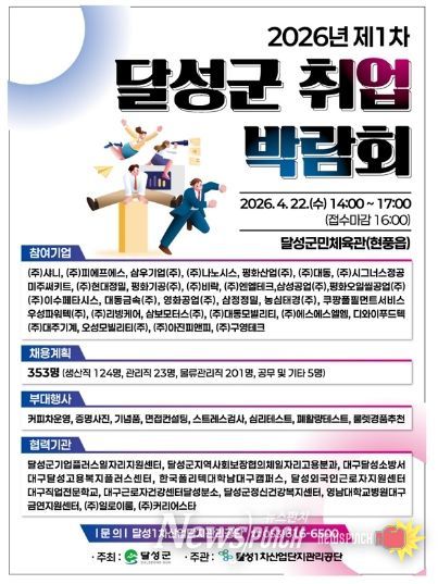 뉴스펀치 조평훈 기자 | 달성군은 지역 경제 활성화와 고용난 해소를 위해 오는 4월 22일 오후 2시부터 달성군민체육관에서 ‘2026 제1차 달성군 취업박람회’를 개최한다.