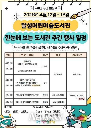 최재훈 달성군수는 “이번 도서관주간 행사를 통해 어린이와 가족들이 책과 더욱 가까워지고, 도서관이 일상 속 즐거운 문화공간으로 자리매김하길 바란다”고 전했다.
