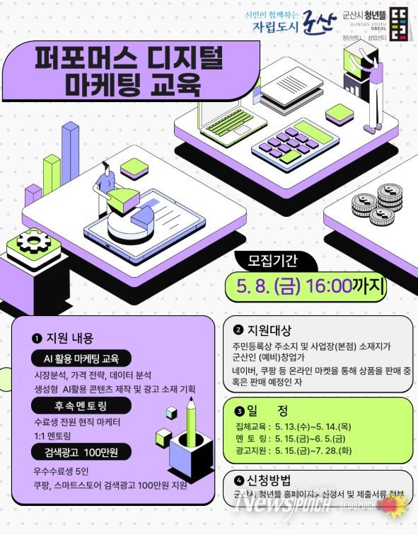 뉴스펀치 최영남 기자 | 군산시 청년뜰 창업센터가 4월 20일부터 5월 8일까지 지역 온라인 창업가의 디지털 마케팅 역량 강화를 위한 '2026년 퍼포먼스 디지털 마케팅 교육' 참여자를 모집한다.