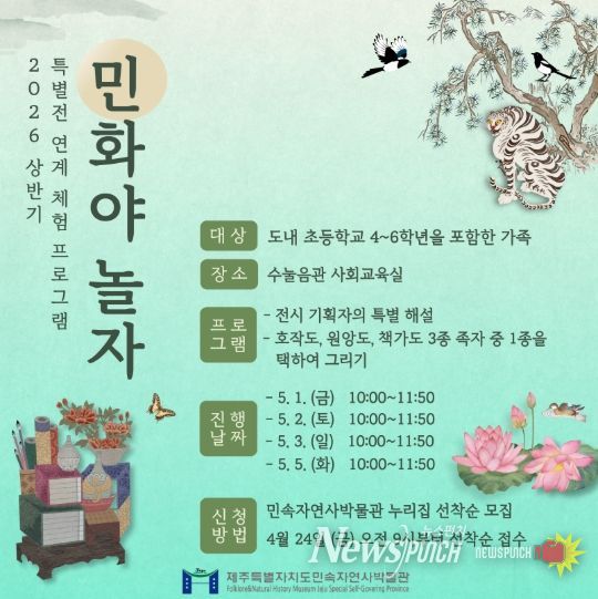 뉴스펀치 김용희 기자 | 제주특별자치도 민속자연사박물관(관장 박찬식)이 5월 연휴 기간 민화 체험 프로그램 ‘민화야 놀자'를 운영한다.