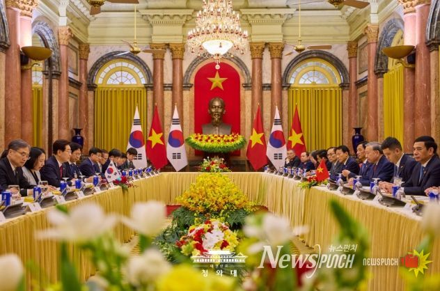 뉴스펀치 김용희 기자 | 베트남을 국빈 방문 중인 이재명 대통령은 22일(현지시간) 오후 베트남 국가주석궁에서 또 럼 당서기장 겸 국가주석과 정상회담을 갖고, 양국 간 포괄적 전략 동반자 관계 발전 방안과 지역·국제 정세 등에 대해 심도 있게 논의했다고 이규연 청와대 홍보소통수석이 서면 브리핑했다.