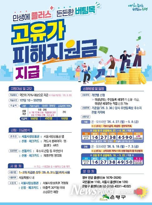 뉴스펀치 박상훈 기자 | 서울 은평구는 고유가·고물가 등으로 커진 구민들의 생활비 부담을 덜고 지역 내 소비를 촉진하기 위해 오는 27일부터 ‘고유가 피해지원금’을 지급한다고 밝혔다.
