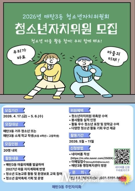 뉴스펀치 박상훈 기자 | 수원시 영통구 매탄3동은 매탄3동 주민자치회가 지역 청소년의 참여를 확대하고, 향후 지역사회를 이끌어 나갈 역량을 기르기 위해 2026년 청소년자치위원회 위원을 모집한다고 밝혔다.
