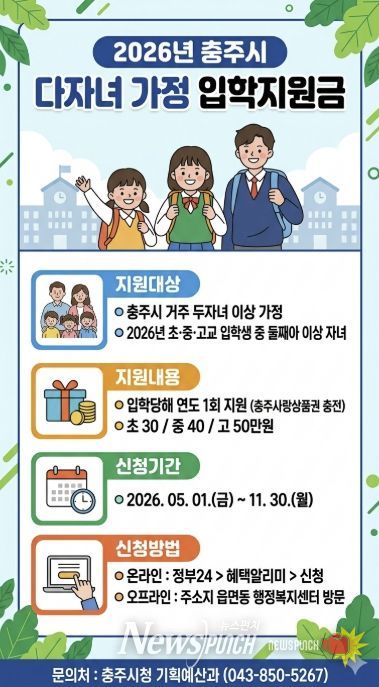 뉴스펀치 강영선 기자 | 충주시는 다자녀 가정의 경제적 부담을 완화하고 안정적인 양육 환경을 조성하기 위해 2026학년도 초·중·고등학교에 입학하는 둘째 자녀 이상에게 입학지원금을 지원한다고 밝혔다.