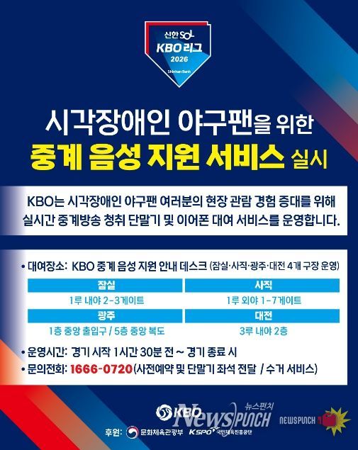 뉴스펀치 박세훈 기자 | KBO는 2023년부터 잠실, 사직, 광주 구장에서 운영해 온 ‘KBO 리그 시각장애인 현장 관람객 대상 중계 음성 지원 서비스’를 올해 대전 한화생명 볼파크까지 확대해 총 4개 구장에서 운영한다.