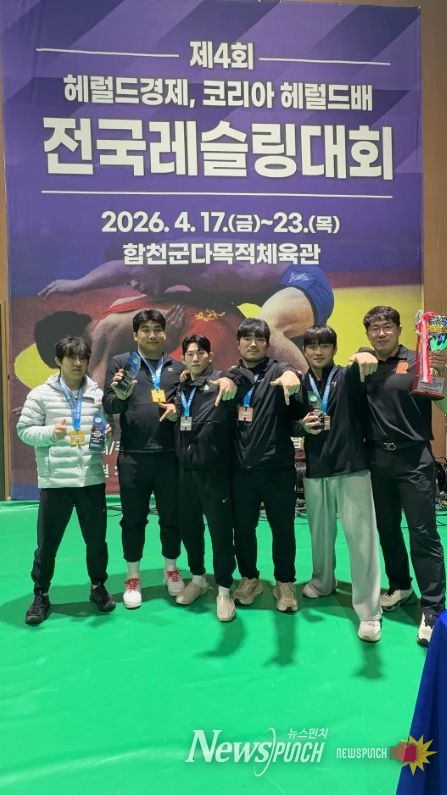 뉴스펀치 손석남 기자 | 칠곡군청 레슬링팀이 17일부터 합천다목적체육관에서 개최된‘제4회 헤럴드경제· 코리아헤럴드배 전국레슬링대회’에서 금메달 1개와 은메달 2개, 동메달 2개를 획득하며 단체종합우승을 거머쥐었다.