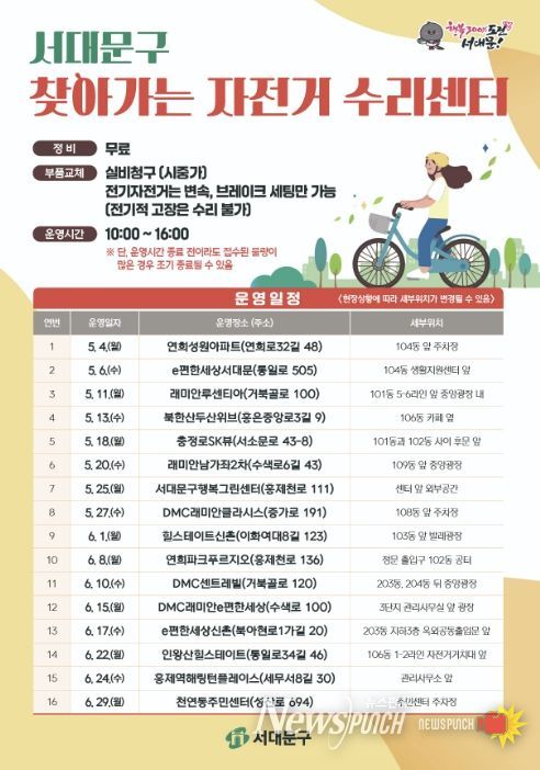 뉴스펀치 박상훈 기자 | 서대문구가 주민들의 자전거 이용 활성화와 안전한 운행을 위해 5∼6월과 9∼11월 ‘찾아가는 자전거 수리센터’를 총 32회 운영한다.