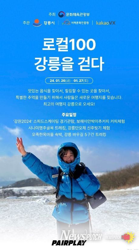 뉴스펀치 김희경 기자 | 문화체육관광부 유인촌 장관은 ‘2024 강원동계청소년올림픽(강원2024)’ 진종오·이상화 조직위원장, ‘강원2024’ 홍보대사 ‘클라씨’, ‘로컬100’ 참여 신청자 등 50여 명과 함께 1월 26일과 27일, ‘로컬100 보러 로컬로’ 캠페인 두 번째 편, ‘로컬100, 강릉을 걷다’ 현장을 찾아간다. 특히 유 장관은 ‘강원2024’와 ‘로컬100’을 연계해 캠페인을 더욱 확산한다.