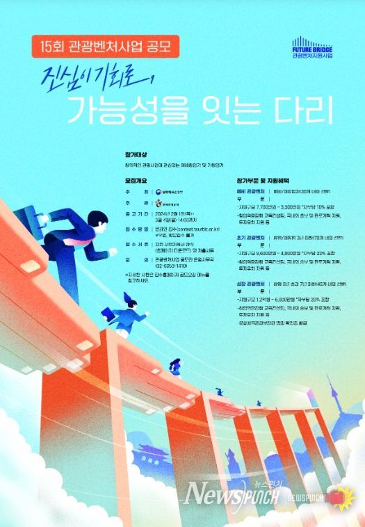 뉴스펀치 김희경 기자 | 문화체육관광부는 한국관광공사(사장직무대행 서영충)와 함께 2월 1일부터 3월 4일까지 ‘제15회 관광벤처사업 공모전’을 열고 창의적이고 혁신적인 아이디어를 지닌 관광 분야의 예비창업자와 창업기업 140곳을 발굴해 지원한다.