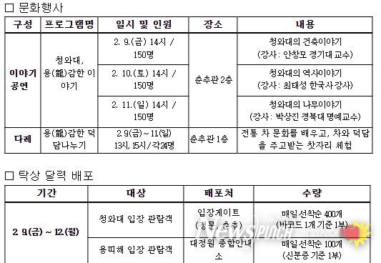 뉴스펀치 김희경 기자 | 문화체육관광부는 청와대재단(이사장 정갑영)과 함께 설 연휴를 맞이해 2월 9일부터 11일까지 청와대 일원에서 ‘청와대, 용(龍)감한 설날’ 문화행사를 진행한다.