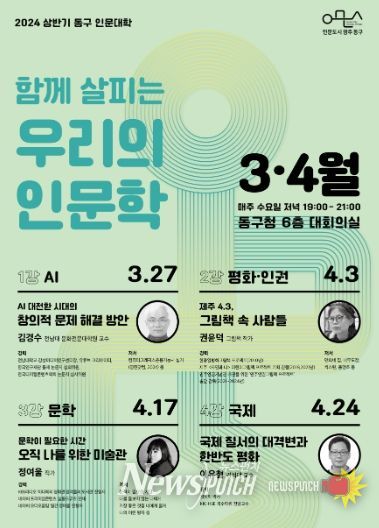 뉴스펀치 조은별 기자 | 광주 동구는 ‘함께 살피는 우리의 인문학’을 주제로 우리 사회 각 분야를 대표하는 명망 있는 강사들을 모시고 올해 동구 인문대학의 문을 연다고 밝혔다.