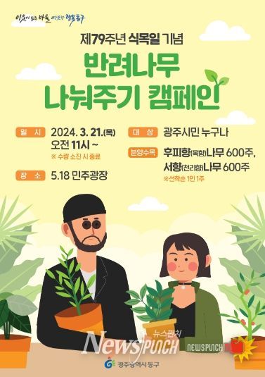 뉴스펀치 조은별 기자 | 광주 동구는 제79회 식목일(4월 5일)을 앞두고 직접 나무를 가꾸며 생활 속 환경 운동을 실천하는 문화 확산을 위해 오는 21일 5·18민주광장에서 ‘반려 나무 나눔’ 행사를 개최한다고 밝혔다.