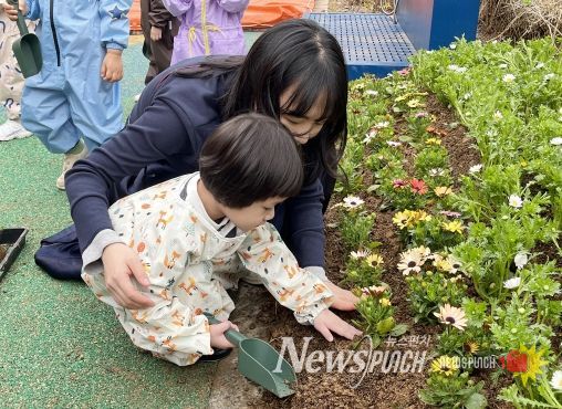 이날 원아들은 어린이집 일원에 수국 5주, 샤스타데이지 등 6종 360본을 심고 재활용 페트병을 집에서 가져와 상추, 쪽파, 깻잎 등 4종의 친환경 작물들을 심었다.
