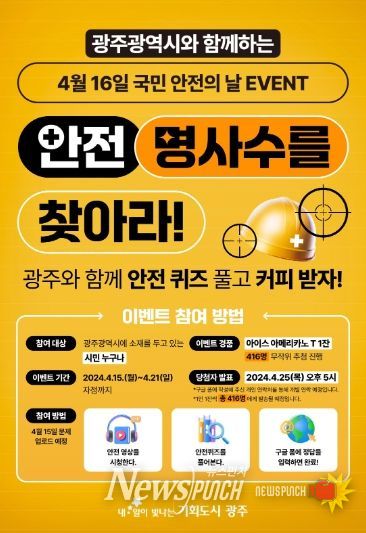 뉴스펀치 조은별 기자 | 광주광역시는 시민들의 안전에 대한 관심을 높이기 위해 오는 15일부터 21일까지 온라인 이벤트 ‘안전 명사수를 찾아라’를 진행한다.