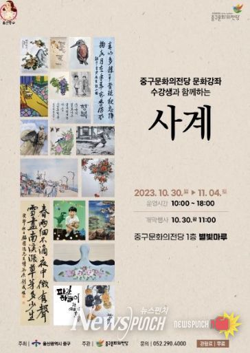 뉴스펀치 임정용 기자 | 울산 중구문화의전당(관장 한은숙)이 기획전시의 일환으로 ‘중구문화의전당 문화강좌 수강생과 함께하는 사계展’을 오는 10월 30일부터 11월 4일까지 6일 동안 중구문화의전당 1층 별빛마루에서 연다.