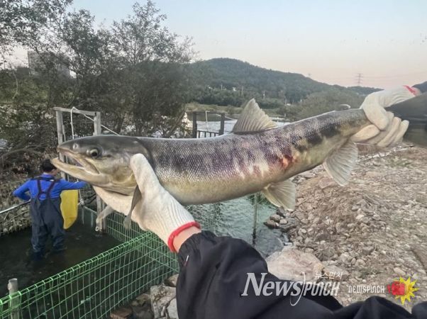 뉴스펀치 임정용 기자 | 울주군 구영교 일대에서 산란을 위해 고향으로 돌아온 회귀 연어가 올해 처음으로 포획됐다.