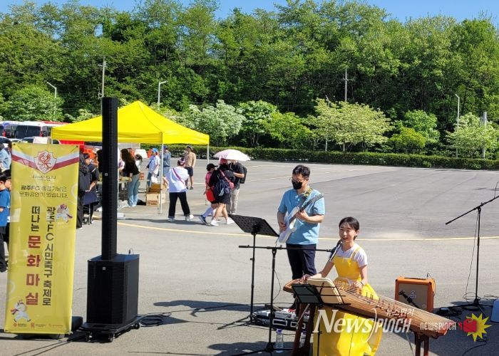 광주FC 홈경기가 있는 날에는 ‘스포츠와 함께 떠나는 문화마실’ 공연이 경기장 1매표소와 2매표소에서 다채롭게 열리고 있다. 대중적이고 흥미로운 버스킹, 퓨전국악, 전자바이올린과 전자첼로의 연주 등 다양한 장르의 공연을 선보이고 있다.