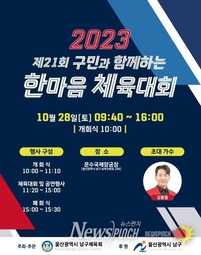 뉴스펀치 임정용 기자 | 울산 남구는 오는 28일 문수국제양궁장에서 주민의 화합과 단결을 도모하는 축제의 장인 ‘제21회 구민한마음체육대회’를 개최한다고 밝혔다.