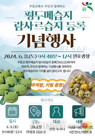 문인 북구청장은 “국제적으로 다양한 생물종의 핵심 서식지로 인정받은 평두메습지를 알리고자 준비한 이번 행사에 주민들의 많은 관심과 성원 바란다”며 “앞으로 관계기관·단체와 적극 협업해 습지를 현명하게 이용하고 보존하여 평두메습지가 지역 활성화의 마중물이 될 수 있도록 최선을 다하겠다”고 말했다.