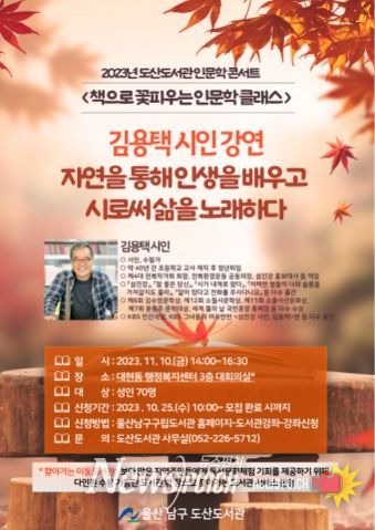 뉴스펀치 임정용 기자 | 울산 남구 도산도서관은 11월 10일 인문학 콘서트 ‘찾아가는 이동도서관’ 김용택 시인 강연을 운영한다고 밝혔다.