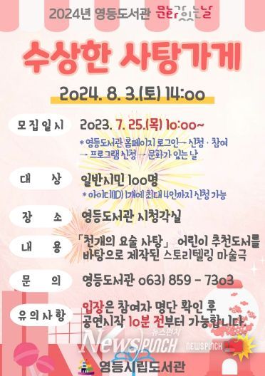 뉴스펀치 유동국 기자 | 익산시 영등시립도서관이 여름방학을 맞아 '문화가 있는 날' 행사로 오는 8월 3일 시청각실에서 어린이 마술극 '수상한 사탕가게'를 선보인다.