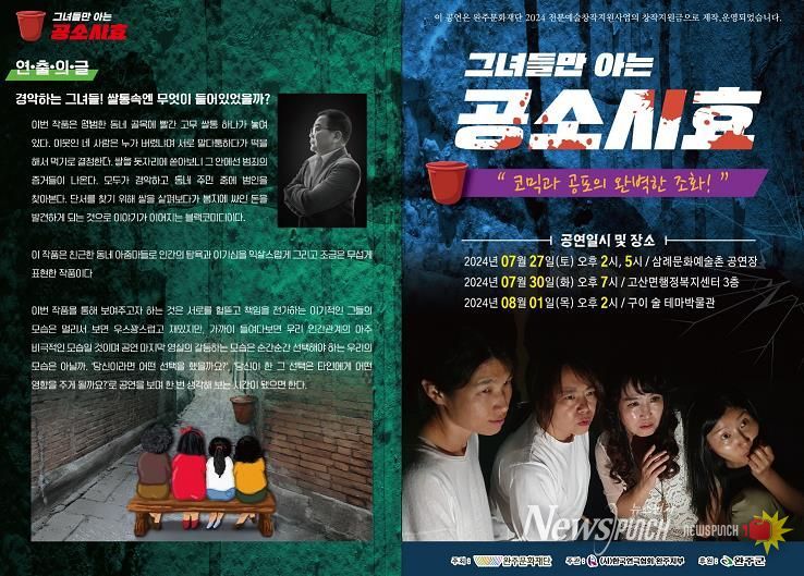 조용한 골목길이 하루아침에 쌀통 때문에 한바탕 소동이 일어나는 내용을 담은 ‘그녀들만 아는 공소시효’는 완주문화재단의 2024 전문예술창작지원사업 결과지원에 선정된 작품으로 오는 7월 27일 삼례문화예술촌 공연장에서 오후 2시에 첫 공연을 시작으로 동일 오후 5시와 7월 30일 오후 7시에 고산면 행정복지센터 그리고 8월 1일 오후 2시에 구이 술 테마박물관까지 총 4회에 걸쳐 진행 한다.