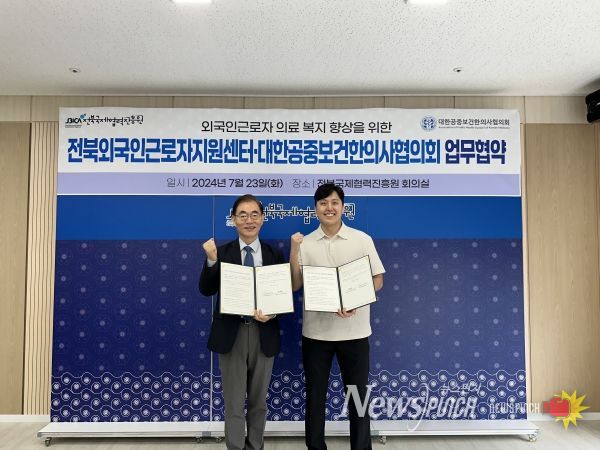뉴스펀치 유동국 기자 | 전북외국인근로자지원센터는 대한공중보건한의사협의회와 23일 전북국제협력진흥원 회의실에서 ‘외국인근로자의 의료 복지 향상을 위한 한의 진료 업무협약’을 체결했다.