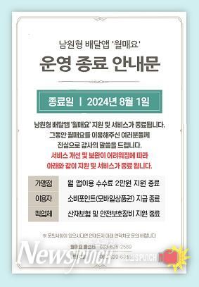 뉴스펀치 유동국 기자 | 남원시가 지역 소상공인의 배달 앱 수수료 부담을 덜어주기 위해 도입했던 배달 앱 '월매요'의 운영을 8월 1일부터 종료한다고 밝혔다.