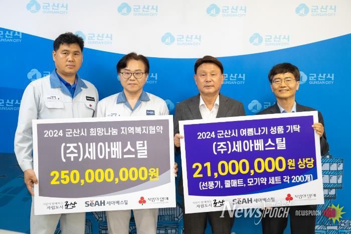 특히 이 자리에서 세아베스틸은 군산시 저소득층 가정의 건강한 여름나기 지원으로 선풍기 등 2천 1백만원 상당의 여름나기 성품까지 함께 기탁해 자리를 더욱 빛냈다.