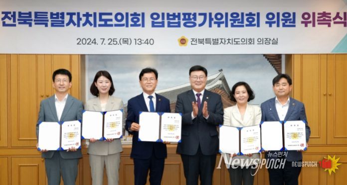 뉴스펀치 유동국 기자 | 전북특별자치도의회는 17일 의장실에서 입법 평가를 통한 조례의 실효성 확보와 자치입법의 질적 향상 도모를 위해 신규 입법평가위원 5명에 대한 위촉식을 가졌다.