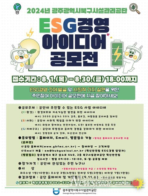 뉴스펀치 조은별 기자 | 광주광역시북구시설관리공단은 작년에 이어 두 번째로 올해 8월 1일부터 8월 30일까지 약 한 달간 ‘2024년 ESG 경영 주민 참여 아이디어 공모전’을 개최한다고 밝혔다.