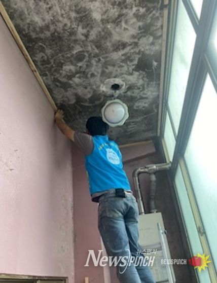 대상 가구는 하당동의 다세대 주택에 거주하는 자로 천장 누수로 집안 곳곳에 곰팡이가 가득한 열악한 환경에서 생활하고 있는 홀로사는 어르신으로 베란다 천장은 물이 새어 곰팡이로 시커멓게 뒤덮여 있었다.