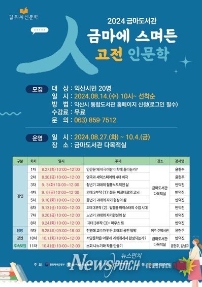 뉴스펀치 유동국 기자 | 익산시 금마도서관이 '2024년 길 위의 인문학'사업으로 오는 27일부터 '금마에 스며든 고전 인문학' 프로그램을 운영한다.