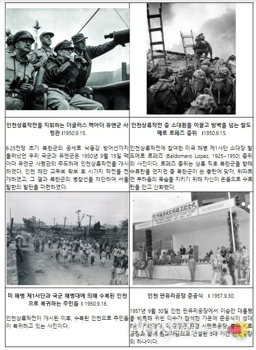 이번 특별사진전에는 6·25전쟁 당시 인천의 모습과 한미 양국이 전쟁을 거쳐 고난과 역경을 딛고, 군사동맹에서 경제·군사·문화 등 다방면에서 포괄적인 글로벌 동맹으로 성장해 온 모습을 80여 점의 사진을 통해 확인할 수 있다.